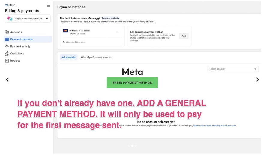 Then from the business manager panel you will have to enter a form of payment (credit account or bank account) to pay Facebook directly for the model messages you send monthly.€0.05 each (the rest of the conversation is free).