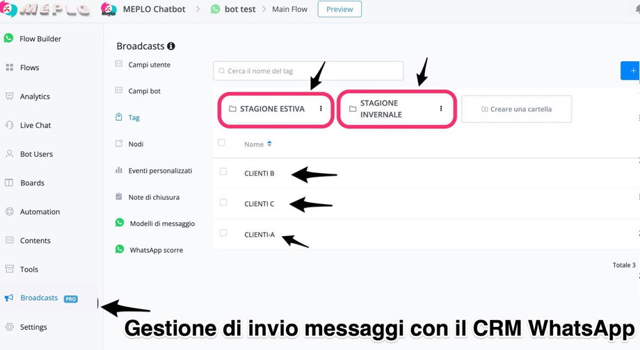 Don't invest money on other expensive CRMs! With the Meplo.it chabot you will be able to manage customers, assign tags, notes, and filter customers into specific folders as well as send messages.